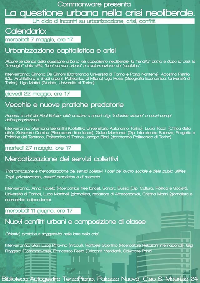 Gli audio del primo incontro del ciclo seminariale “La questione urbana” (Torino, 7 maggio 2014): “Urbanizzazione capitalistica e crisi”, con introduzione di Salvatore Cominu e Simona De Simoni, interventi di Ugo Rossi e Agostino Petrillo, a seguire dibattito.