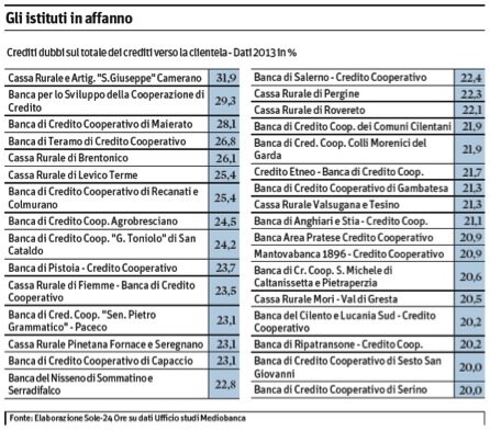 Oltre a Monte dei Paschi di Siena (a seguito delle malversazioni di gestione, connesse con i potentati politici locali), ai primi posti per peso dei NPL sul totale dei prestiti abbiamo la Popolare dell’Emilia Romagna (BPER), la Popolare di Vicenza (BPV), la Cassa di Risparmio di Genova (CARIGE), il Credito Valtellinese, Veneto Banca e Banco Popolare. Se facciamo un’analisi più approfondita, considerando solo il mondo del credito cooperativo, i dati sono ancora più allarmanti. Ben 33 banche secondo le elaborazioni de Il Sole 24 ore su dati Mediobanca si trovano ad affrontare quote di crediti inesigibili superiore al 20% . Il 41% di queste Bcc si trova al Nord, il 27 per cento al Centro e il 32 per cento al Sud.